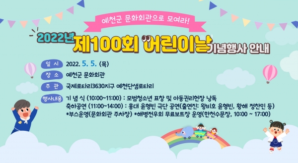 예천군 관계자는 “코로나19로 한동안 멈췄던 일상이 회복되고 오랜만에 야외로 나오는 아이들에게 다양한 경험을 선물해 주고 싶다”며 “볼거리와 즐길거리를 풍성하게 준비했으니 부모님들께서도 아이들이 행복한 어린이날을 보내며 잊지 못할 추억을 가질 수 있도록 많은 참여 부탁드린다”고 말했다.