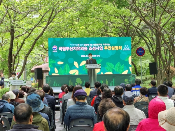 행사는 4월 29일 오후 2시부터 사업현장과 가까운 사하구 당리동 동원베네스트 2차 아파트 마을버스 회차로에서 개최했으며 지역주민을 비롯해 최인호 국회의원, 남송희 남부지방산림청장, 산림청 김주미 산림교육치유과장 등 산림청과 부산시, 사하구 관계자 등 120여명이 참석했다.