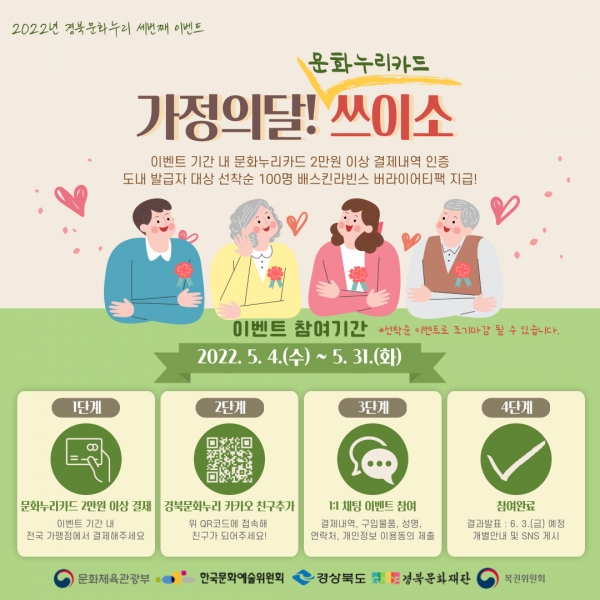[Q뉴스] 경상북도는 경북문화재단과 함께 문화누리카드 지역 이용자를 대상으로‘가정의 달 문화누리카드 쓰이소’이벤트를 진행한다.