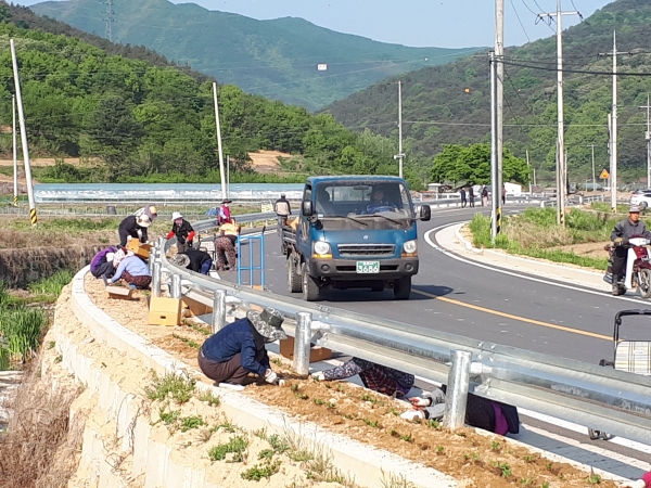 [Q뉴스] 군위군 소보면 보현1리 주민 20여명은 지난 4일 보현1리 마을 주변에 연산홍, 꽃잔디, 해바라기 등을 마을 도로변에 심었다.