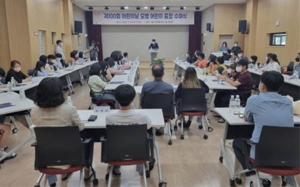 [Q뉴스] 김천시에서는 지난 4일 제100회 어린이날을 맞이해 청소년문화의집 3층 대강당에서 모범어린이 27명과 부모님 25여명이 참석해 표창장 수여식을 개최했다.