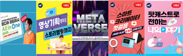 ‘한 눈에 보는 미디어 리터러시’ 강좌부터 미디어 영상 콘텐츠의 기획, 촬영, 스토리텔링, 편집 등 전 과정에 대한 가이드가 제공되며 디지털 사진, 스마트폰 영상, 팟캐스트, 메타버스, OTT, 미디어 아트, 시나리오, 팩트체크 등 다양한 주제의 VOD 콘텐츠를 접할 수 있다.