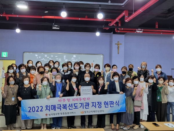 [Q뉴스] 칠곡군보건소 치매안심센터는 지난 9일 성가양로원을 치매극복선도단체로 지정하고 현판식을 가졌다.