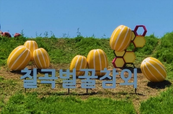 [Q뉴스] 칠곡군은 지난 12일 칠곡벌꿀참외의 경쟁력 강화와 우수성 홍보를 위해 약목면 남계저수지 사면에 위치한 ‘칠곡벌꿈참외 상징조형물 준공식’을 개최했다.