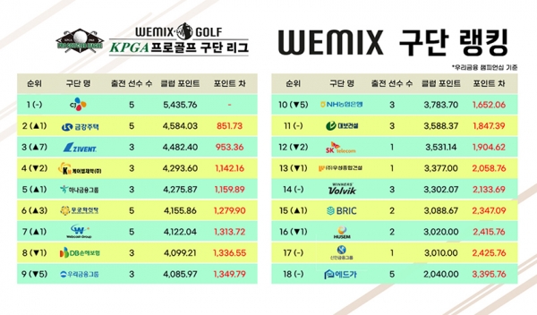 ‘제41회 GS칼텍스 매경오픈’ 종료 후 3509.6.2포인트로 ‘위믹스 구단 랭킹’ 1위에 올랐던 CJ는 15일 끝난 ‘우리금융 챔피언십’에서 1926.7포인트를 추가해 5,435.76포인트로 ‘위믹스 구단 랭킹’ 1위를 수성했다.