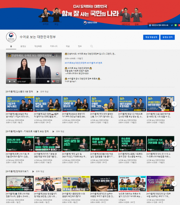문화체육관광부는 한 걸음 더 나아가 청각장애인의 알 권리를 보장하고 한국수어에 대한 인식을 확산하기 위해 지난 3월 11일 국민에게 유용한 정부 정책을 수어로 자세히 알려주는 ‘수어로 보는 대한민국정부’ 유튜브 채널을 개설해 운영하고 있다.