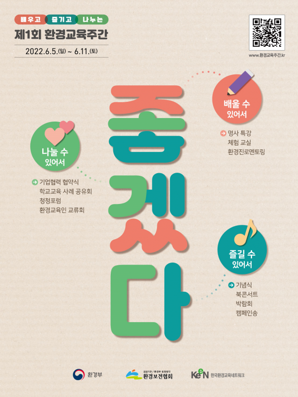 환경교육주간은 ‘좋겠다, 배우고 즐기고 나누는 환경교육주간’이라는 표어 아래, 다양한 기관과 단체에서 전 국민이 즐겁게 배우고 참여할 수 있는 다채로운 교육 행사를 선보인다.