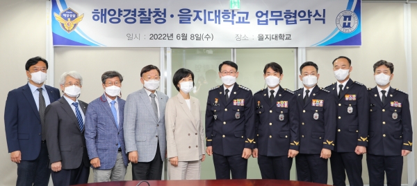 [Q뉴스] 해양경찰청은 지난 8일 오전 을지대학교 국제회의실에서 의료·보건, 교육·채용 등 다양한 분야에서의 실질적인 교류협력을 위한 업무협약을 체결했다고 밝혔다이번 업무협약은 양 기관의 상호발전 및 우호협력관계 증진을 통해 국민의 소중한 생명을 보호하고 생명존중의 가치를 실현하는 우수한 인재를 육성하고자 체결됐다.