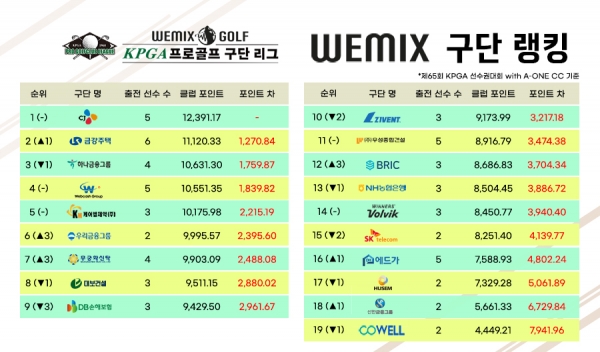 ‘SK텔레콤 오픈 2022’ 종료 후 1만 162.42포인트로 ‘위믹스 구단 랭킹’ 1위에 올랐던 CJ는 12일 끝난 ‘제65회 KPGA 선수권대회 with A-ONE CC’에서 2228.75포인트를 추가해 1만 2391.17포인트로 ‘위믹스 구단 랭킹’ 선두를 유지했다.