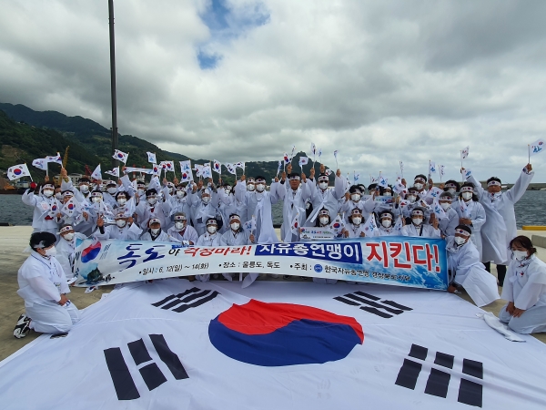 [Q뉴스] 경상북도는 13일 독도에서 한국자유총연맹 경북도지부가 일본의 독도침탈 야욕을 강력 규탄하고 독도가 역사적·지리적·국제법적·실효적으로 명백한 대한민국 고유 영토임을 천명하는 독도수호 결의대회를 가졌다고 밝혔다.