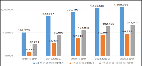 현재 65세 이상 노인의 사전연명의료의향서 등록 건수는 전체 작성자의 77.9%로 노인복지관은 어르신 대상 전문상담과 연계해 연명의료에 대한 자기결정권을 행사할 수 있는 접근성을 높이며 제도 사각지대를 해소할 것으로 기대된다.