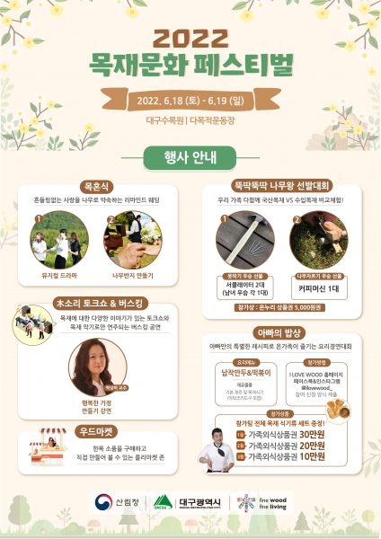 [Q뉴스] 산림청은 기후변화를 해결해 줄 목재의 가치를 다시 알고 산림자원 선순환에 대한 인식을 높이기 위해 ‘생활 속 목재 이용으로 탄소중립 실현하기’를 주제로 2022 목재문화축제를 6월 18일부터 19일까지 이틀 동안 대구수목원에서 개최한다고 밝혔다.