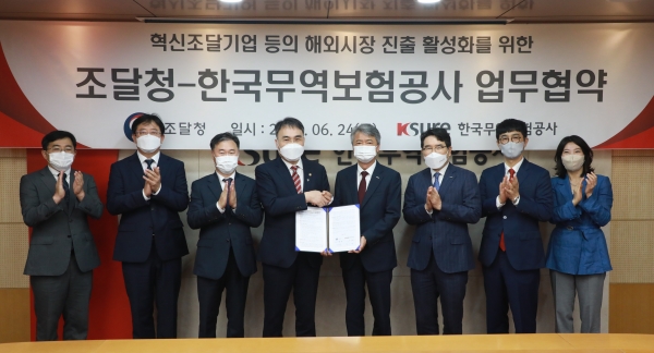 조달청과 한국무역보험공사는 24일 서울 종로구 소재 한국무역보험공사 본사에서 우수 조달기업의 해외 진출 지원을 위한 업무협약을 체결했다.