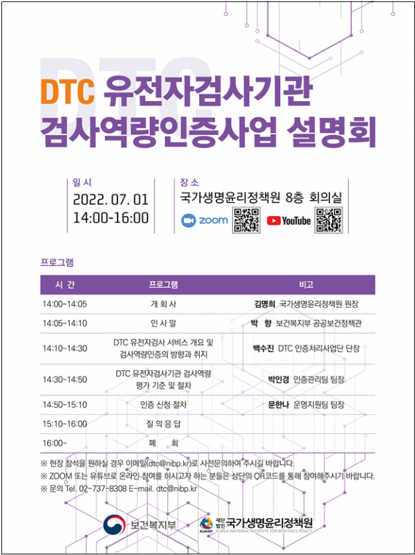 [Q뉴스] 보건복지부와 국가생명윤리정책원은‘소비자 대상 직접 시행 유전자검사역량 인증제’설명회를 7월 1일 오후 2시 국가생명윤리정책원에서 개최한다고 밝혔다.