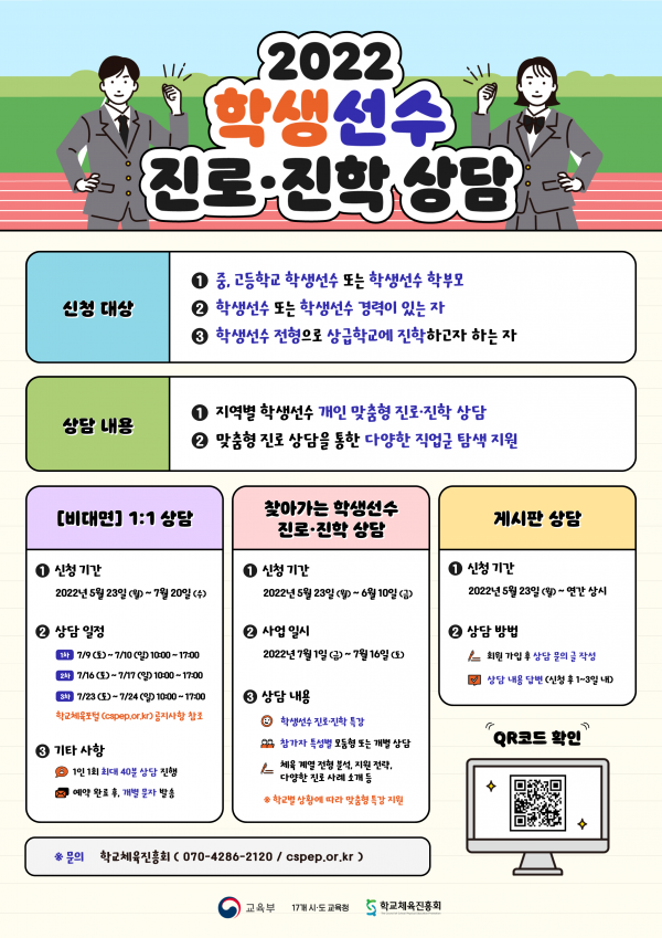 [Q뉴스] 교육부는 17개 시도교육청, 학교체육진흥회와 함께학생선수의 진로를 고민하고 맞춤형 진로상담을 통한 다양한 직업군 탐색 기회 및 진로 개발을 지원하기 위해 ‘2022년 학생선수 진로·진학상담 프로그램’을 운영한다.