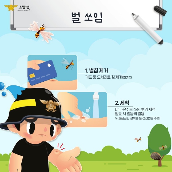 벌에 쏘였을 경우 신속하게 벌침을 제거하고 쏘인 부위의 감염방지를 위해 소독하거나 깨끗한 물로 씻은 후 신속히 119에 신고해야 한다.