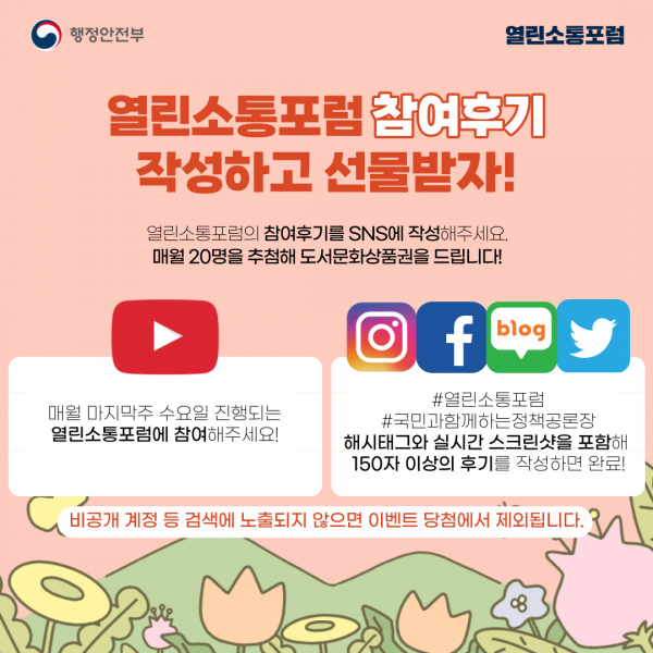 ‘열린소통포럼’은 국민 생활에 밀접한 주제를 선정해 국민, 전문가, 정부가 함께 논의하고 집단지성으로 정책 제안을 발굴하고 정책에 반영하는 국민참여 정책토론장이다.