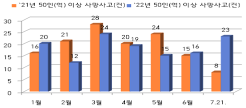 이에 전체 사망사고에서 차지하는 50인 이상 사망사고 비중은상반기 35% 수준에서 7월에는 56.1%로 급증했다.