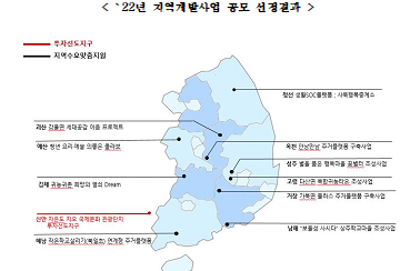 1) 지역 성장거점을 육성하고 민간투자를 활성화하기 위한 기반시설 조성2) 지방 유입인구 수요를 반영한 지역맞춤형 생활거점 조성 올해에는 민간 전문가로 구성된 평가위원회의 서류 심사, 현장 점검 및 최종 발표평가를 거쳐 투자선도지구 1개, 지역수요맞춤지원 10개 등 총 11개의 신규 지역개발사업을 선정했다.