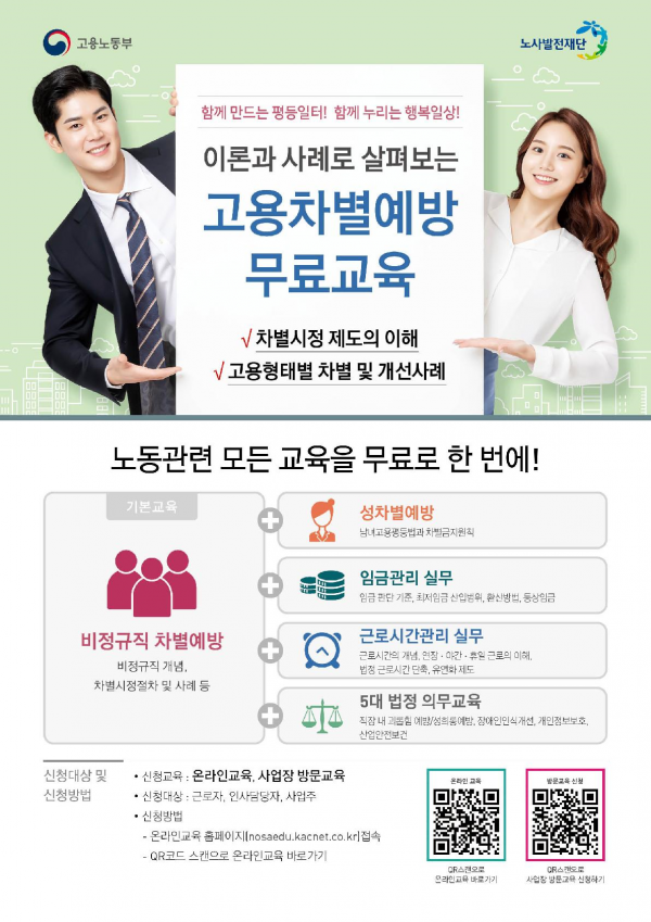 [Q뉴스] 노사발전재단 차별없는일터지원단은 8월 1일부터 전국 사업장 임직원을 대상으로 ‘고용차별예방 온라인 학습실’을 운영한다.