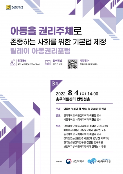 [Q뉴스] 보건복지부와 아동권리보장원은 8월 4일 오후 2시 충무아트센터 컨벤션 홀에서 제3차 “아동기본법 제정을 위한 연속 아동권리 공개토론회”를 개최했다.