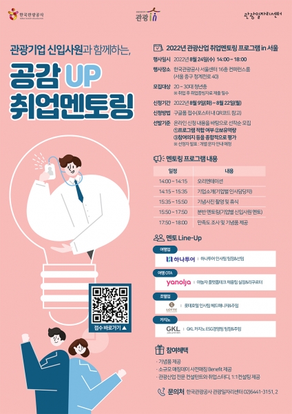 오는 8월 24일 공사 서울센터에서 열리는 이 멘토링 행사는 구직자 맞춤형 취업지원 서비스를 제공하고자 관광일자리센터가 개소한 2018년부터 실시하는 사업이다.