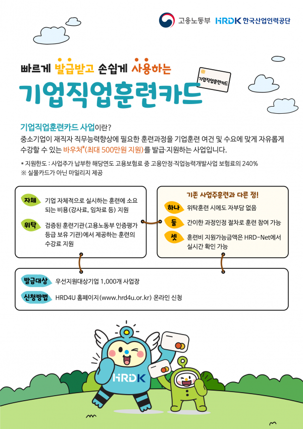 기업직업훈련카드에 참여한 중소기업은 기업당 최대 5백만원의 훈련바우처가 지급되고 고용노동부 직업훈련 포털을 통해 지원가능 금액 및 잔여 한도액을 실시간으로 확인할 수 있다.