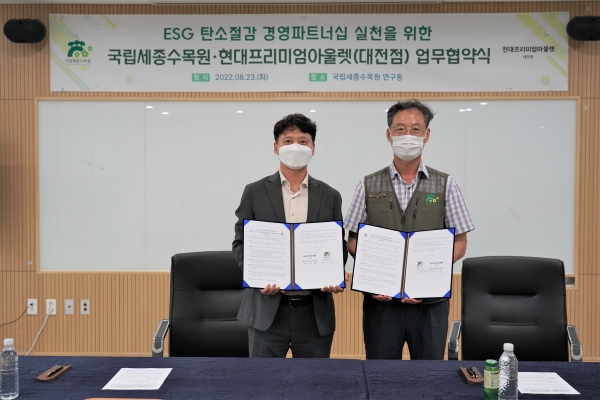 [Q뉴스] 한국수목원정원관리원은 국립세종수목원이 지난 23일 현대프리미엄아울렛 대전점과 ESG 경영실천을 위한 업무협약을 체결했다고 밝혔다.