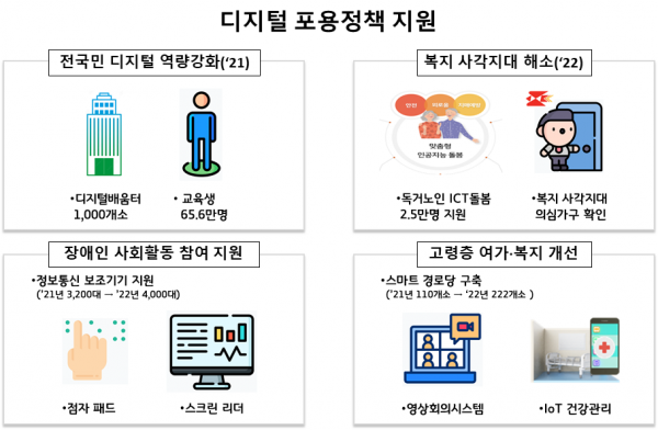 박윤규 차관은 “일상생활과 사회·경제 전 영역이 디지털로 전환되는 가운데, 우리 사회의 지속가능성을 높이고 함께 잘사는 나라를 구현하기 위해서는 디지털 분야에서 취약계층에 대한 고려와 배려가 반드시 필요하다”고 강조했다.