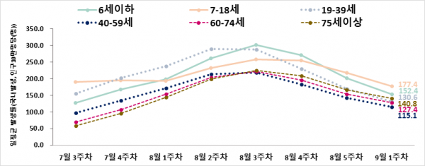 9월 1주간 신규 위중증 환자수는 483명으로 전주 대비 3.6%로 소폭 증가했으며 사망자는 415명으로 전주 대비 19.4% 감소했다.