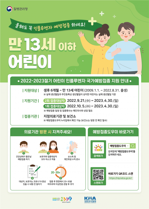 인플루엔자 예방접종은 21일 2회 접종이 필요한 어린이부터 시작하며 이후 1회 접종 어린이와 임신부는 10월 5일 어르신 중 만 75세 이상은 10월 12일부터 가장 먼저 시작한다.