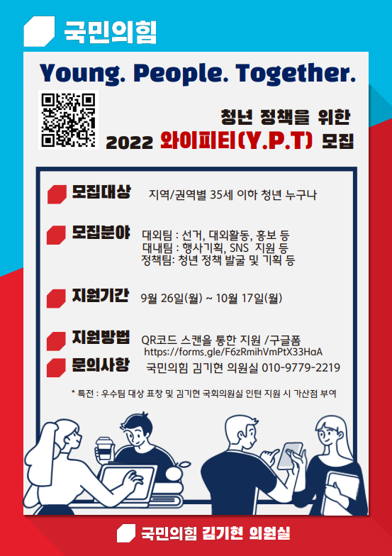 와이피티는 영피플투게더의 약자로 오는 9월 26일부터 10월 17일까지 의원실 공식 블로그의 구글폼 링크를 통해 모집 예정이며 만 19세 이상 35세 미만의 청년이면 누구나 지원이 가능하다.