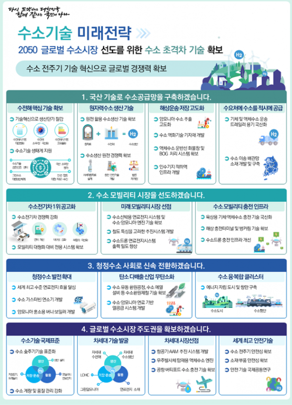 ‘수소기술 미래전략’에서 제시한 주요 전략은 국산 기술로 수소 공급망 구축, 기술 기반으로 수소 모빌리티 시장 선도, 기술혁신을 통한 청정수소 사회로 전환, 기술 기반으로 글로벌 수소시장 주도권 확보의 4가지 이며 정부는 동 전략에 대해 다양한 의견 수렴 후 연말까지 확정해 추진해 나갈 계획이라고 전했다.