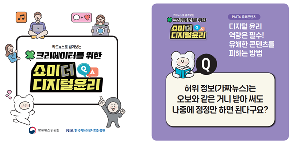 이는 그간, 방통위가 가짜뉴스, 사이버폭력, 명예훼손 등 크리에이터들이 제작하면서 겪을 수 있는 어려움과 해결방안을 알기 쉽도록 홍보한 카드뉴스를 책자로 제작한 것으로 관계부처 및 크리에이터 지원 기획사) 등 민간에도 배포할 계획이라고 전했다.