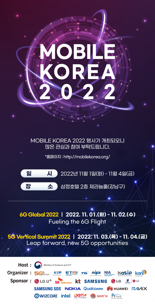 ‘모바일코리아 2022’는 5세대 이동통신의 경험을 바탕으로 5세대 이동통신 융합서비스 시장과 나아가 6세대 이동통신 비전 및 기술표준을 선도하는 등 차세대 이동통신 분야에서 국제 지도력을 확보하기 위해 마련된 것으로 ‘20년부터 ‘6세대 이동통신 글로벌’과 ‘5세대 이동통신 버티컬 서밋’을 합쳐 진행되고 있다.