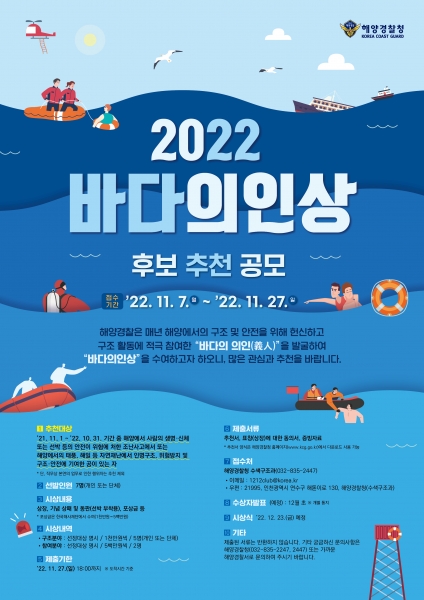 [Q뉴스] 해양경찰청은 11월 7일부터 오는 27일까지 2022년 “바다의인상” 후보를 공모한다고 밝혔다.