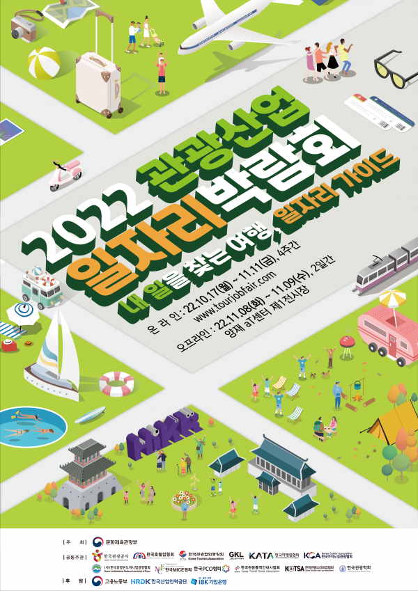 [Q뉴스] 문화체육관광부와 한국관광공사, 한국호텔업협회, 한국관광협회중앙회 등 12개 관계기관이 함께 개최하는 ‘2022 관광산업 일자리 박람회’가 11월 8일부터 9일까지 서울 양재동 에이티센터에서 개최된다.