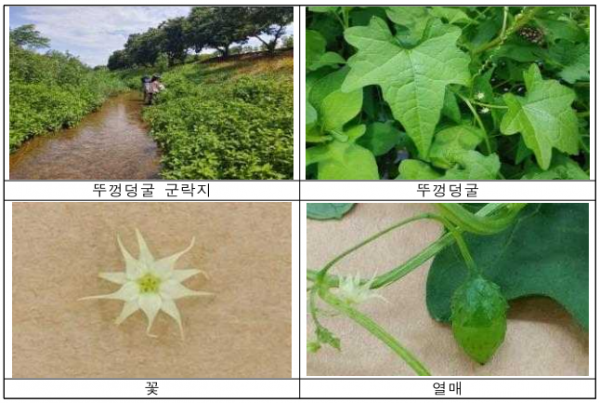 뚜껑덩굴은 제비꽃목 박과에 속하는 한해살이 덩굴식물로 제주도와남부 지방에 분포하며 연못가 및 하천변 등 습도가 높고 물기가 많은 곳에서 서식한다.