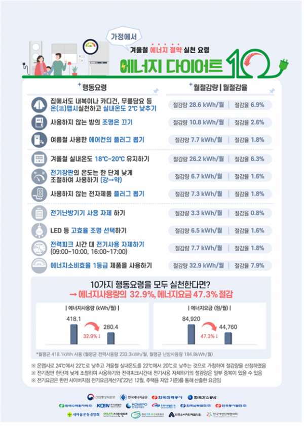 산업부는 겨울철 ‘에너지 다이어트 10 실천요령’을 배포하며 각 기관 캠페인 시 이를 적극 활용해 줄것을 당부하는 한편 전국민적 관심과 동참의 필요성을 강조했다.