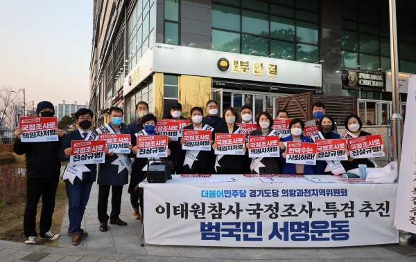 [Q뉴스] 더불어민주당 의왕과천지역위원회는 17일 오후 의왕시 오전동 서해그랑블 앞 기업은행사거리에서 ‘이태원참사 국정조사·특검추진 범국민 서명운동’을 가졌다.