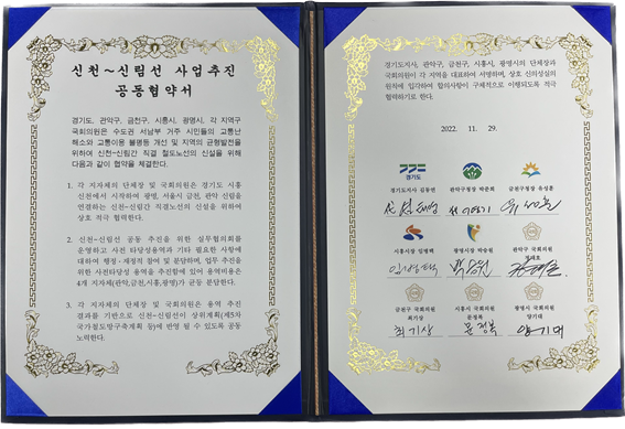 이번 공동협약서는 신천~신림선 공동 추진을 위한 실무협의회를 구성하고 ‘사전타당성 용역’을 공동으로 추진하는 등 상호 협력체계를 구축해 신천~신림선의 ‘제5차 국가철도망구축계획’ 반영을 목표로 한다.