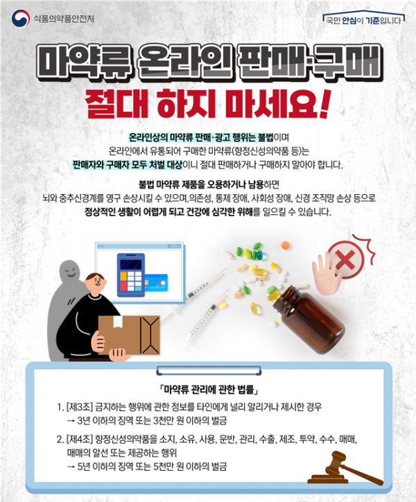 마약류를 판매·광고하는 행위는 국민건강을 심각하게 위협하는 불법행위로 처벌 대상이며 구매하는 행위도 처벌 대상이다.