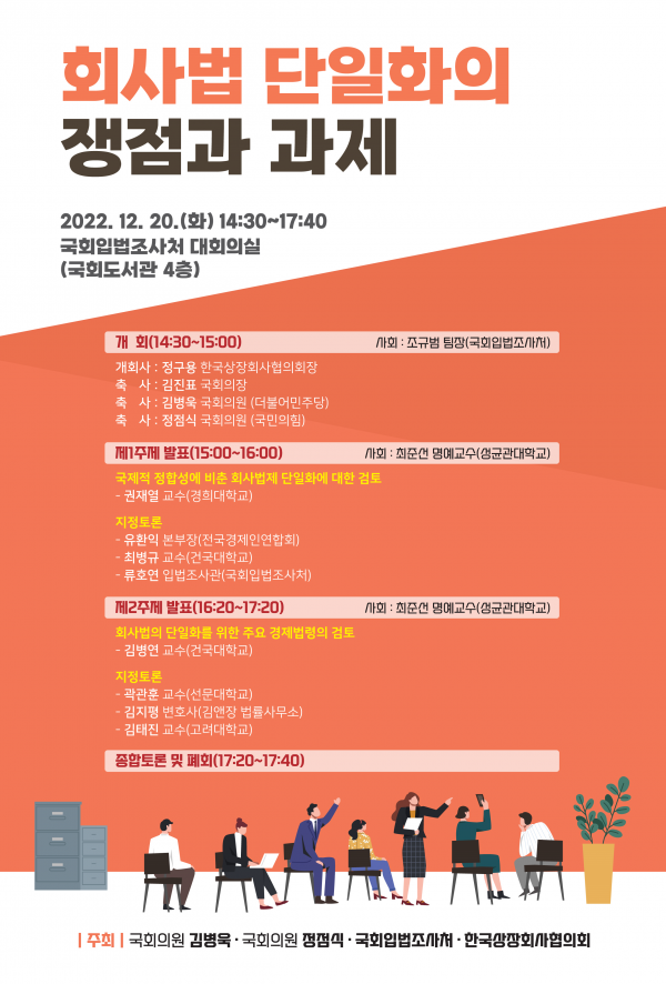 권재열 교수가 첫 번째로 ‘국제적 정합성에 비춘 회사법제 단일화에 대한 검토’를 발제하고 이어 김병연 건국대 교수가 ‘회사법의 단일화를 위한 주요 경제법령의 검토’를 주제로 발표한다.