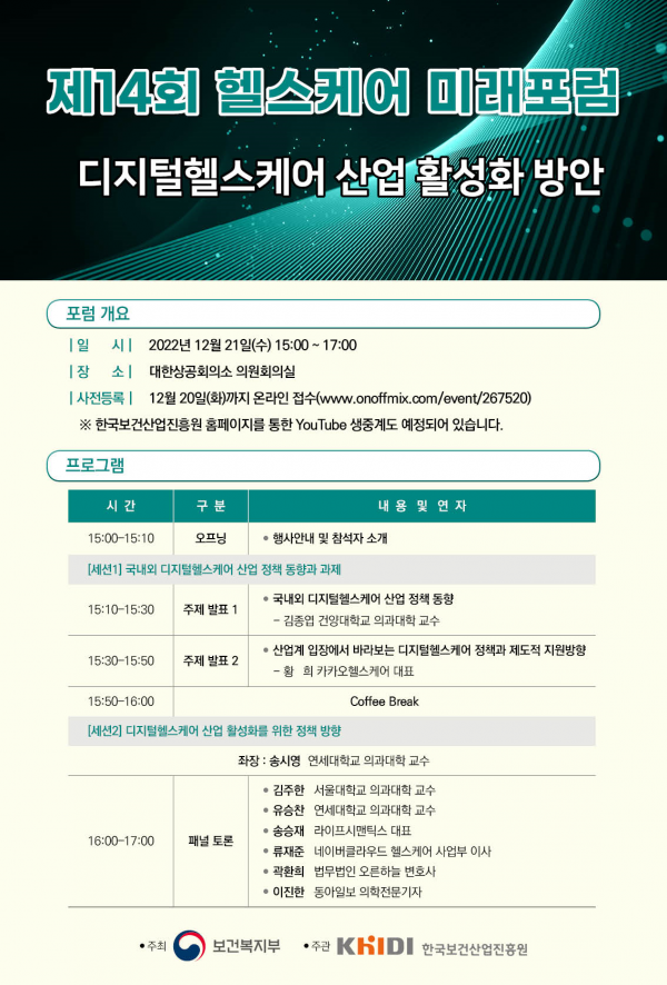 [Q뉴스] 보건복지부와 한국보건산업진흥원은 12월 21일 오후 3시 서울 상공회의소에서 ‘디지털헬스케어 산업 활성화’을 주제로 ‘제14회 헬스케어 미래 공개토론회’를 개최한다고 밝혔다.