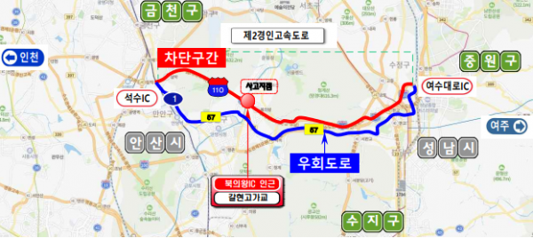 현재 사고가 발생한 지점을 포함해 석수IC부터 여수대로IC 구간 21km를전면 통제하고 있고 인근 국지도 57호선 등을 우회도로 노선으로 지정했다.