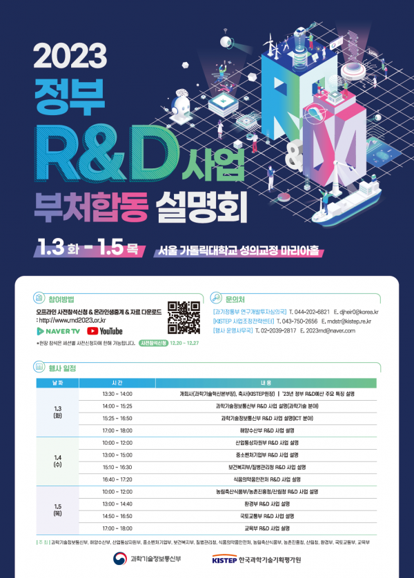 [Q뉴스] 과학기술정보통신부는 정부연구개발 사업을 수행하는 13개 중앙행정기관과 합동으로 “2023년도 정부연구개발사업 부처합동설명회”를 1월 3일부터 5일까지 서울 가톨릭대학교 성의교정에서 개최한다고 밝혔다.