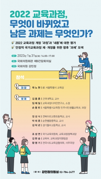 1월 31일 오후 2시부터 국회의원회관 제9간담회의실에서 진행될 ‘2022 교육과정, 무엇이 바뀌었고 남은 과제는 무엇인가?’ 토론회는 작년 말 확정, 고시된 2022 교육과정의 개정 과정과 내용을 전문연구자, 교사, 교육기관 담당자들이 종합적으로 평가하고 향후 과제를 모색하는 자리이다.