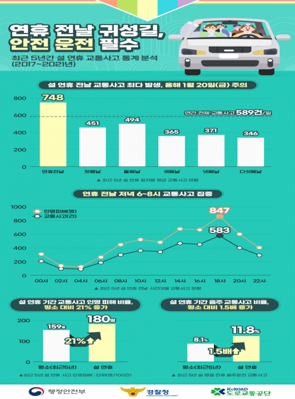 도로교통공단의 빅데이터 분석에 따르면, 설 명절 전후로 교통사고 발생이 가장 많은 시기는 연휴 시작 전날로 평소 589건보다 1.3배 정도 많은 748건이 발생했고 시간대는 오후 6시경에 가장 많았다.