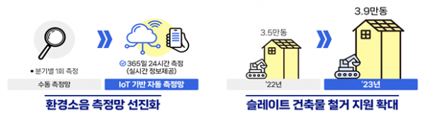 국민들이 일상생활에서 느끼는 소음 발생정보를 실시간으로 확인할 수 있도록, 환경소음측정망을 수동 측정망에서 사물인터넷 기반의 자동측정망으로 교체해 분기별 1회 제공하던 정보를 실시간으로 제공한다.