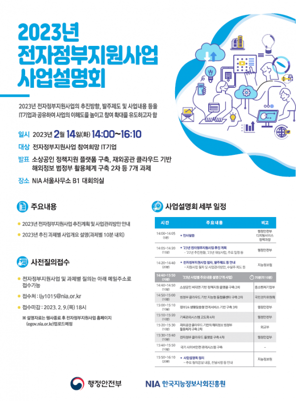 [Q뉴스] 행정안전부는 2월 14일 오후 2시부터 한국지능정보사회진흥원 서울사무소에서 정보기술 기업 등을 대상으로 ‘2023년 전자정부지원사업 사업설명회’를 개최한다고 밝혔다.
